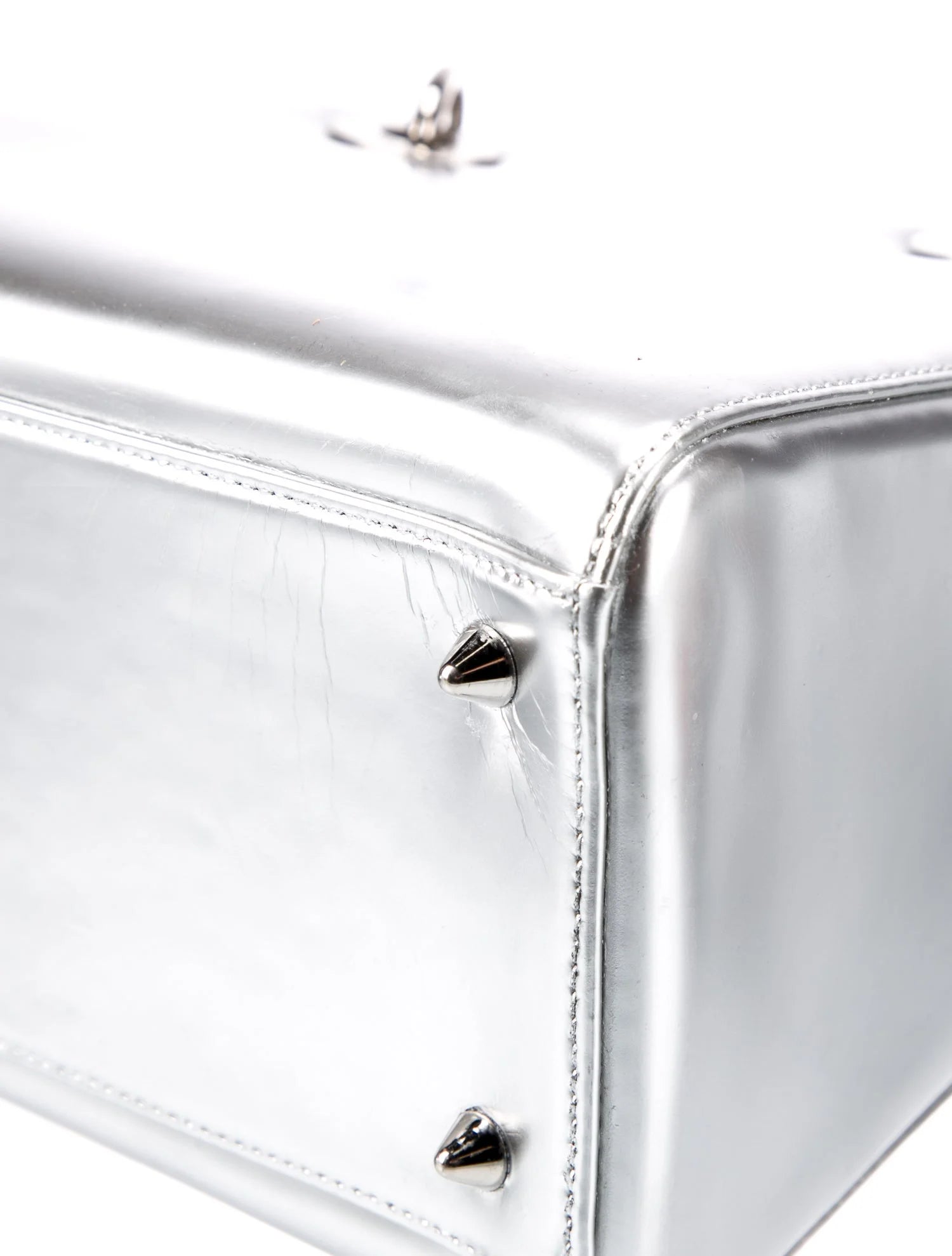Arañazos pronunciados en el interior; pliegues moderados en la base; decoloración moderada en los herrajes; arañazos moderados en los herrajes; hendiduras moderadas en el exterior; residuos menores en el interior; calvicie menor en el cierre; el artículo ha sido repintado.