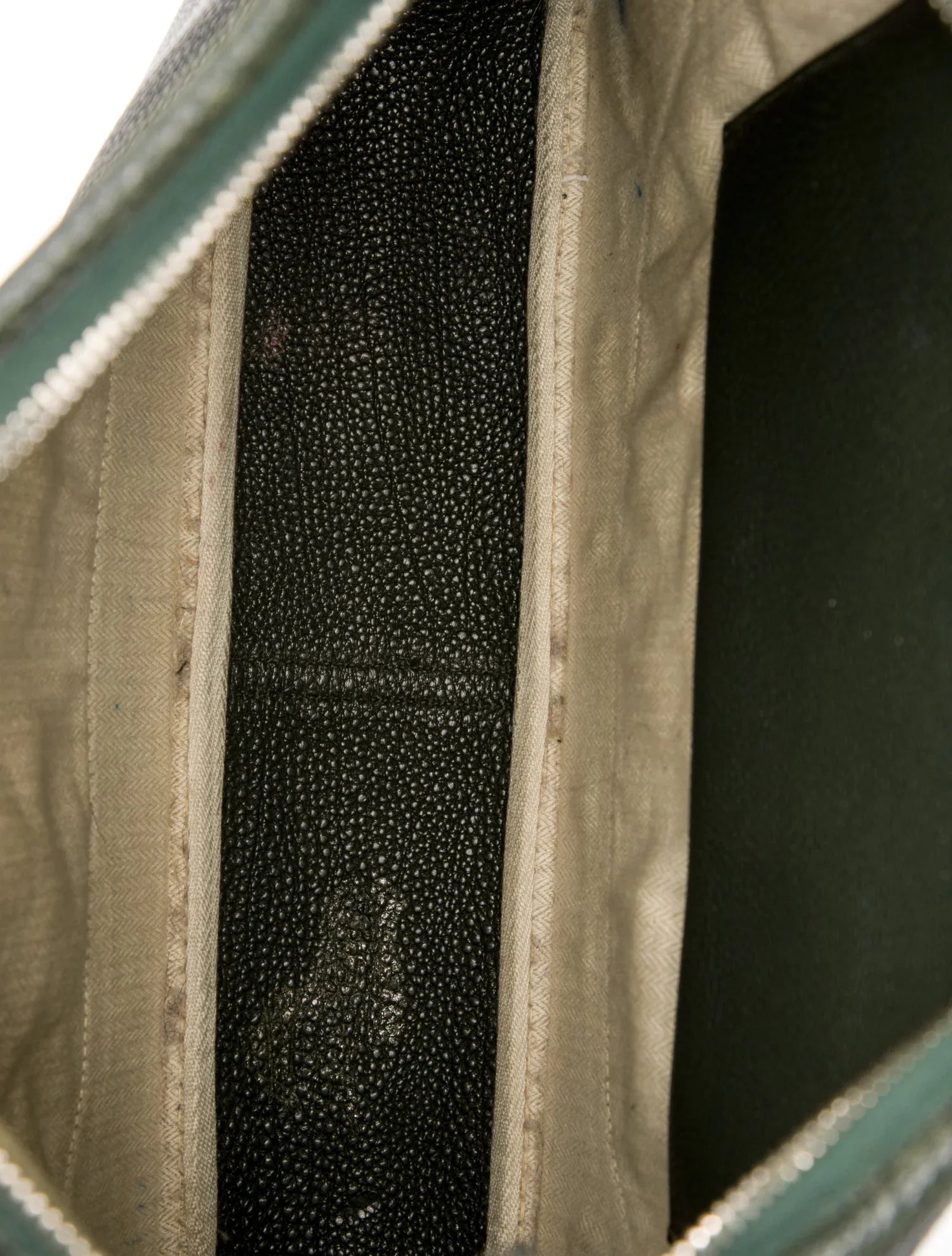 Gran decoloración en el interior; raspaduras moderadas en las esquinas y en la abertura; oxidación moderada en los herrajes; la forma se ha relajado debido al uso